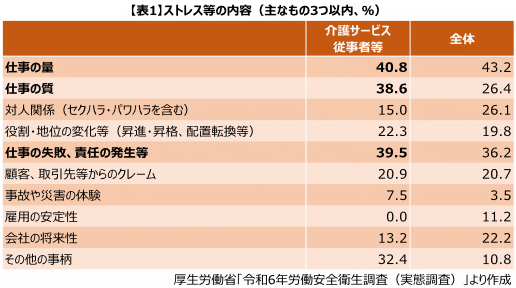 同調査結果から、介護サービス従事者等でストレス等がある人のストレス等の内容をまとめると、表1のとおりです。