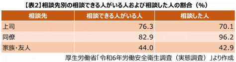 相談できる人がいる人は、同僚が82.9%で最も高くなりました。次いで上司が76.3%、家族・友人は44.0%でした。相談した人の割合は、同僚が96.2%で最も高く、上司が70.1%で続いています。